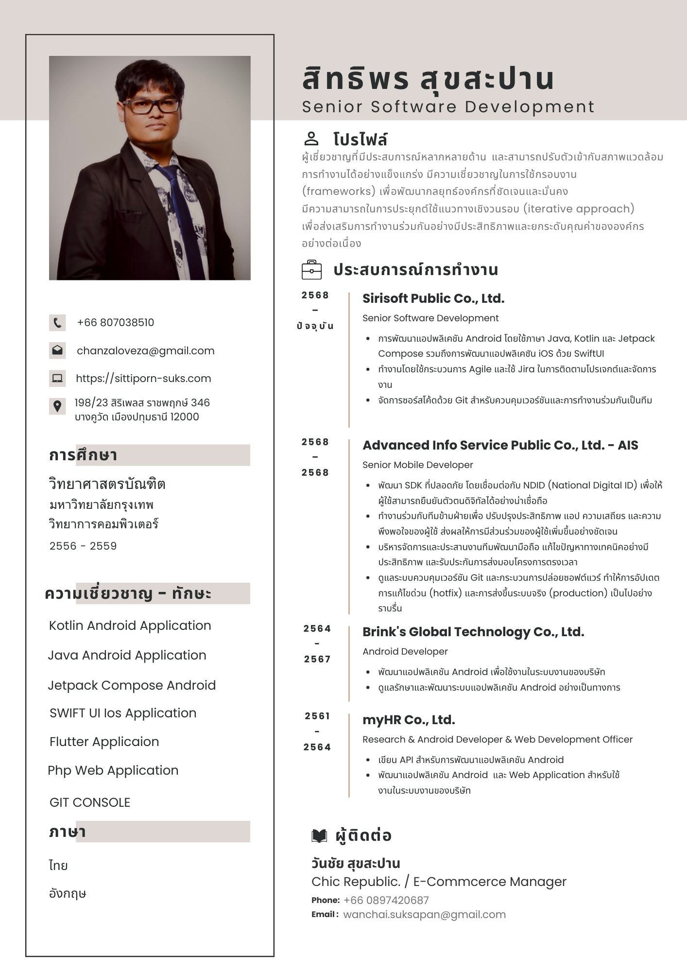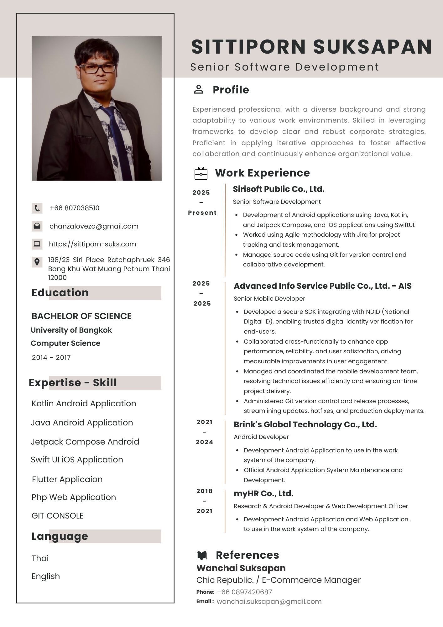- พัฒนาซอฟต์แวร์มือถือที่ AIS โดยเชี่ยวชาญทั้งในแพลตฟอร์ม Android และ iOS หน้าที่ของผมครอบคลุมถึงการออกแบบ พัฒนา และปรับแต่งแอปพลิเคชันมือถือ เพื่อมอบประสบการณ์การใช้งานที่ราบรื่นและตอบโจทย์ด้านนวัตกรรมทางธุรกิจ ผมทำงานร่วมกับทีมงานหลากหลายฝ่ายอย่างใกล้ชิด เพื่อให้มั่นใจว่าแอปของเราสอดคล้องกับเป้าหมายเชิงกลยุทธ์ พร้อมทั้งคงไว้ซึ่งประสิทธิภาพ ความน่าเชื่อถือ และความพึงพอใจของผู้ใช้ในระดับสูง